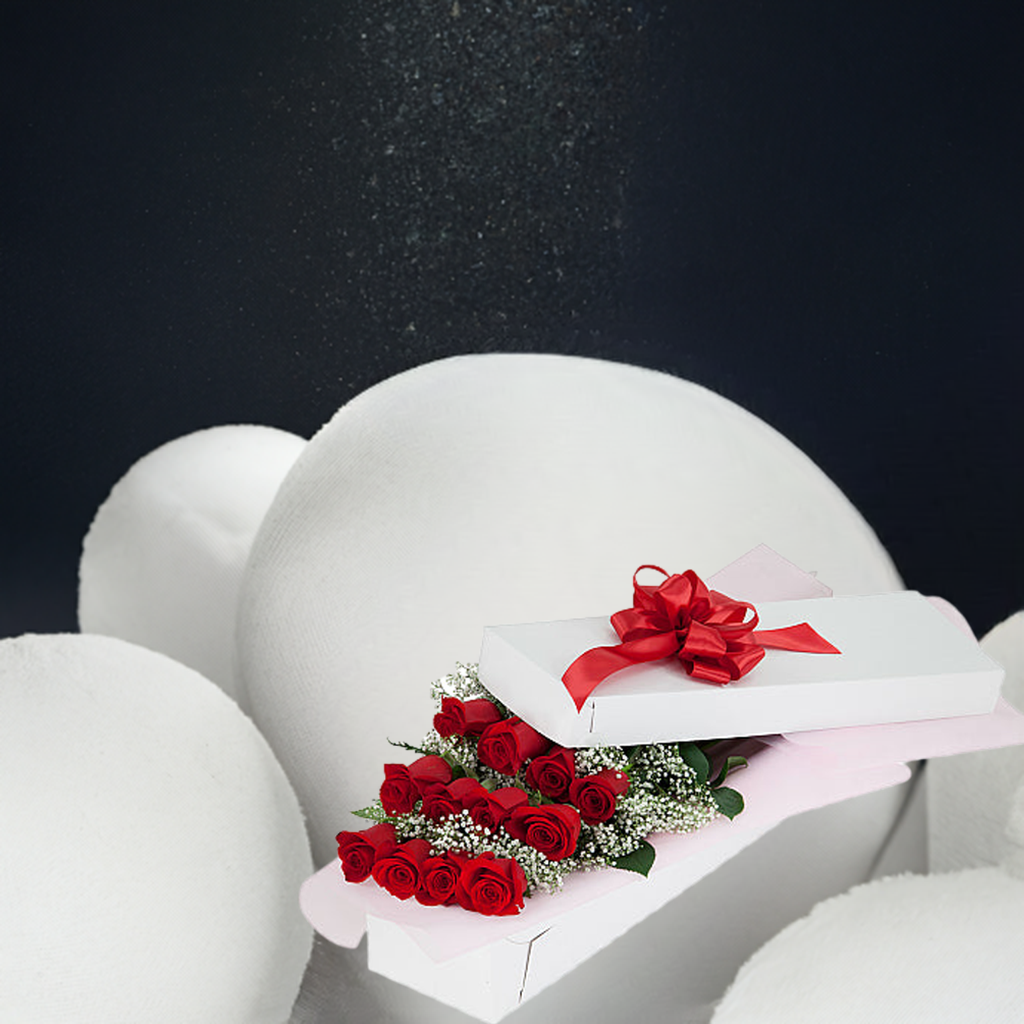 This Valentine's Day, give her a classic gift of one dozen red roses with baby's breath, expertly arranged in a rose gift box with matching red bow.