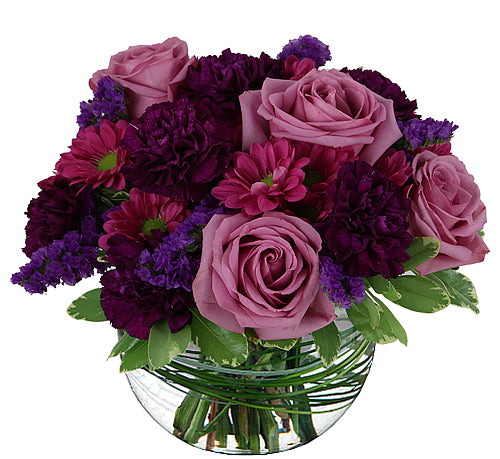 Lavender roses, purple Matsumoto asters, fuchsia carnations, mauve daisies and purple statice combine voices in perfect floral harmony in this lovely glass bowl arrangement that's pefect for sending your fondest anniversary wishes.