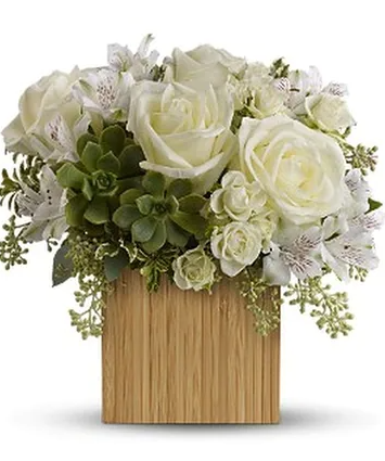Real bamboo is the new style favorite, and it is beautifully realized in this stunning contemporary cube vase. Filled with delicate white roses, it makes a floral gift that is both sophisticated - and sweet