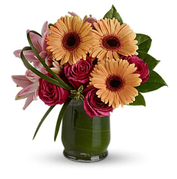 Perk up the party with this fresh burst of pink and peach blooms in a glass hurricane lined with a bold green ti leaf. It's a lot of pizzazz for the money which is great for them - and great for you!