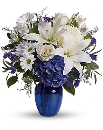 In this arrangement, the serenity of the color blue along with the purity of intention symbolized by white will let the family know you are sending your calm strength to them during these difficult times.