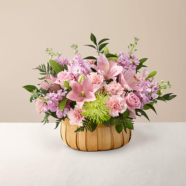 Let them know how much you care with a gorgeous bouquet that features carnations, stock, roses, lilies and Fuji mums. Each bloom is a thoughtful reminder of your support and love, while sitting in a beautifully crafted basket.