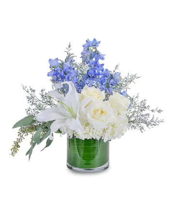 A tranquil melody of blooms in shades of blue and cloud white will deliver your message of wishes for a cool and calm day.
