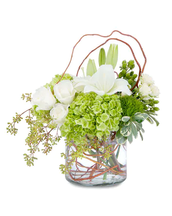 A naturally styled combination of lilies, roses and hydrangea in a clear vase accented with curly willow to make this simply styled design.
