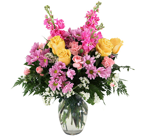 This impressive bouquet charms with yellow roses and mini carnations, lavender daisies and delicate white statice.