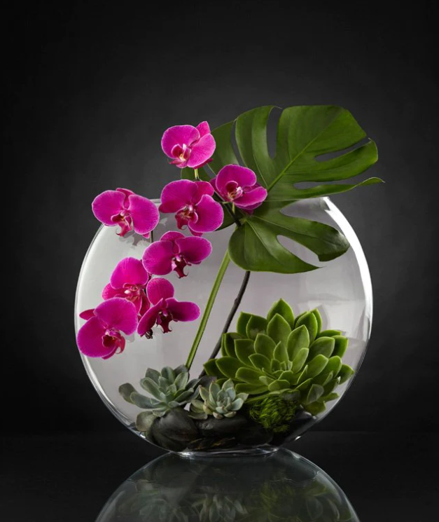 This is simplicity at its finest. Succulents are everyone’s new favorite garden adornment and bring a trend forward styling to this captivating arrangement. Placed in a clear moon vase to give it a modern terrarium look, each element of this piece shines in it’s own way to create a look of perfect elegance. A stem of fuchsia phalaenopsis orchids draws the eye to the lush textures of the overall look in order to captivate the heart and the imagination.