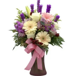 This delightful arrangement will automatically catch your eye and let you dream on and on. Lifting your spirit up and soaring. Perfect for that special someone, let her know she is loved, by sending her flowers today! beautifully designed for you with peach gerberas pink stock ,liatrus, roses, seeded eucalyptus etc. all combined in a pink vase & pink bow.
