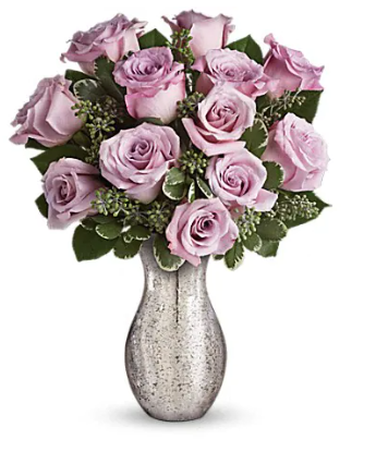 A sparkling mercury glass vase lends a feeling of vintage romance to one dozen delicate lavender roses. It's a bouquet as timeless as your love -and one she'll always remember!