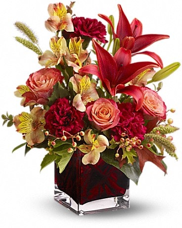 As bright and intense as a hot Indian summer afternoon, this deep red, orange and burgundy bouquet - complemented by autumn-hued oak leaves and feathery millet - is arranged in a modern glass cube vase that's a luscious shade of plum. Who wouldn't love to receive such a gift?