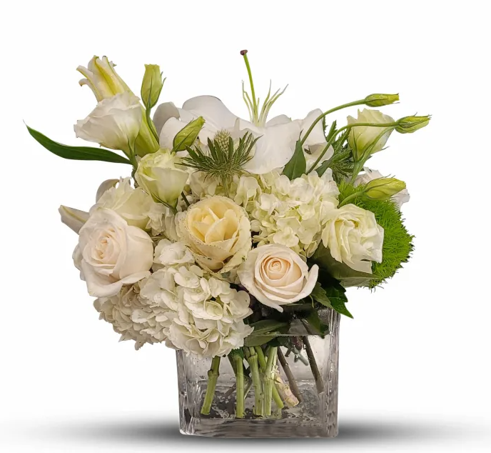 other accent flowers and comes in a square glass container. Having this elegant white bouquet