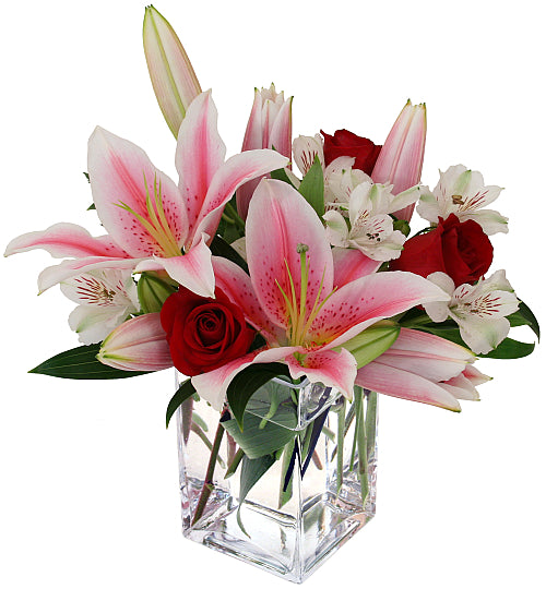 Give her this romantic vase arrangement of stargazer lilies with red roses and delicate alstroemerias.